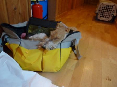 ファイブもお疲れ。自分のクレートあるのに ティちゃんのバックで寝ちゃいました。