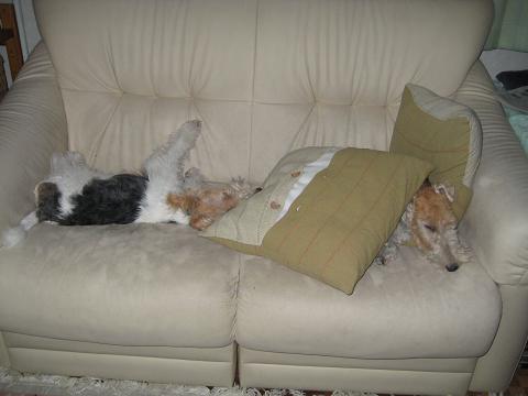 ソファの上でクッションを蹴飛ばしファイブの上に・・・。