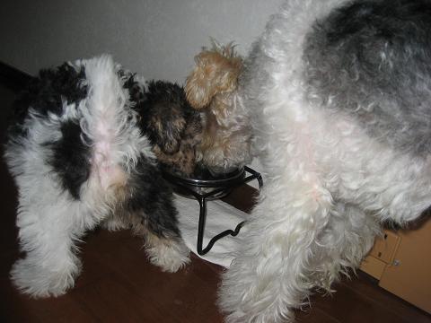 ファイブがご飯の時 フセで待っていたら こまめも真似してフセしていました。