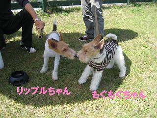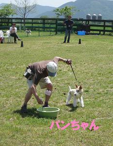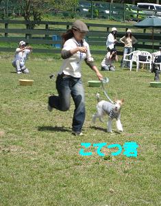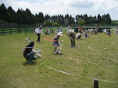 最初のゲーム 輪くぐり。飼い主とわんこが フラフープをくぐるのですが、