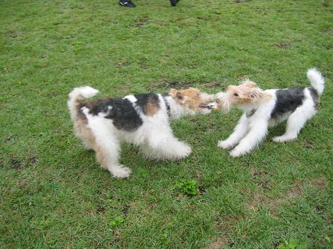 他のわんこの おもちゃを取り合う ファイブとこまめ・・・。
